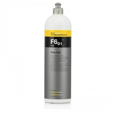 FINE CUT F6.01 Fine Polishing Compound, Silicone-Oil-Free FINE CUT F6.01 is an intelligent machine polish of the latest generation with unique aluminium oxide quality. The intelligent grain size ensures very quick, complete removal of wash system scratches and similar traces of use and gives the paintwork a long-lasting deep sheen. Sanding marks left behind by 2500 grade sanding media are removed effortlessly. FINE CUT F6.01 is therefore ideally suited for perfect reconditioning of medium to heavily weathered paintwork. Perfectly coordinated for the treatment of scratch-proof paint. CUT: 6.0 GLOSS: 7.0 Areas Of Use Paintwork on cars, commercial vehicles, motorcycles, etc.     Recommendations For Use Apply the fine polishing compound to the polishing pad (Koch-Chemie FINE CUT (Yellow) Pad or lambswool pad) and polish the precleaned surface with max. 2.000 rpm crosswise. The cleaning effect can be varied by means of pressure, polishing medium and rpm. At the start of the polishing process we recommend working with greater pressure at a lower speed. In the further course, reduce the pressure and polish to a high gloss at a higher speed. The remaining polish residues can be removed easily with The Rag Company’s Edgeless 300 or Edgeless 365 microfiber cloth. Remove any streaks or traces of polish with Koch-Chemie MICRO CUT M3.02. Warnings Shake before using. Before using, check suitability and compatibility. Do not use on hot surfaces. Protect against frost and excessive heat. Notice This product information can advise you only without obligation. Liability on the part of Koch-Chemie cannot be derived. Please check whether the product is suitable for your application.