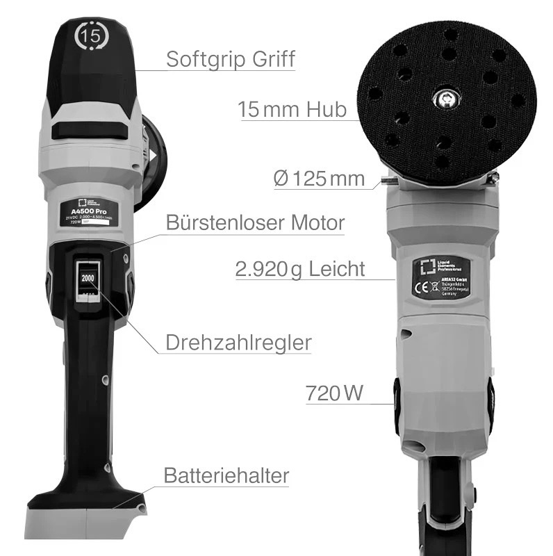 The „A4500 Pro” cordless polishing machine sets new standards in cordless vehicle detailing and is the most powerful model ever developed by LIQUID ELEMENTS. With innovative technology, powerful performance, and maximum freedom of movement, the „A4500 Pro” is aimed at professional detailers, workshops, and ambitious enthusiasts who don’t want to compromise on power or precision.