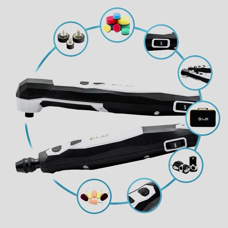 The Liquid Elements A800-1 mini rotary polishing machine is similar to a small drill that you can hold in different ways. You often hold the polisher like a pen to polish small surfaces very accurately and precisely. The small 15mm polishing pad allows you to polish paint on critical surfaces. The machine has a speed controller with which you can regulate the number of revolutions per minute between 2500 and 4500 rpm in 5 positions.