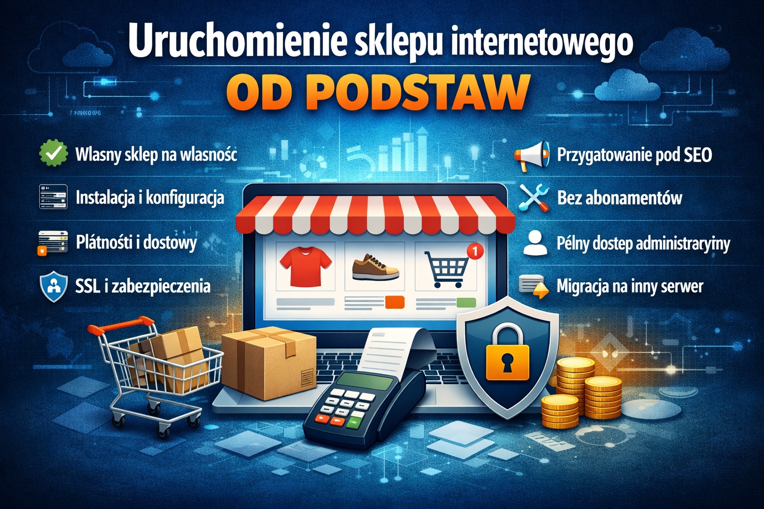- instalację i konfigurację silnika sklepu internetowego (open-source, bez opłat licencyjnych),
